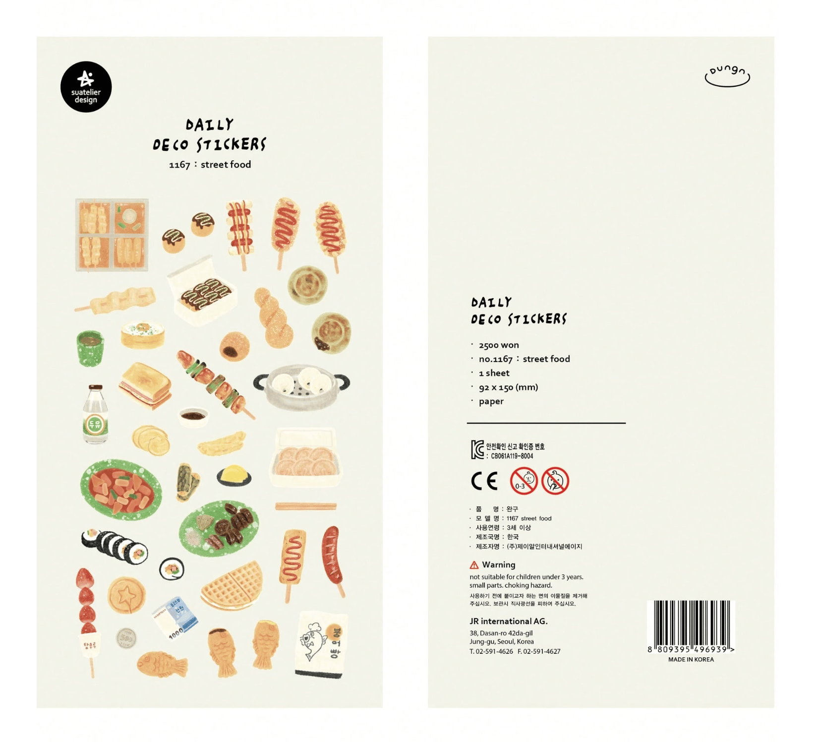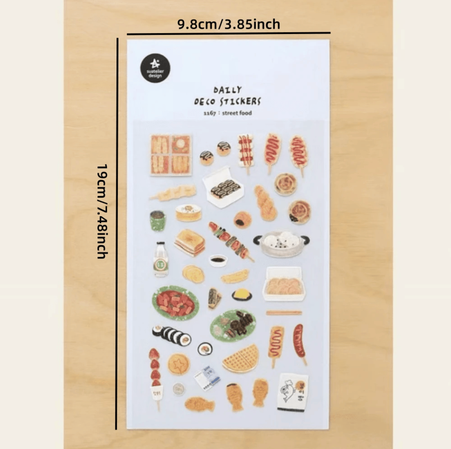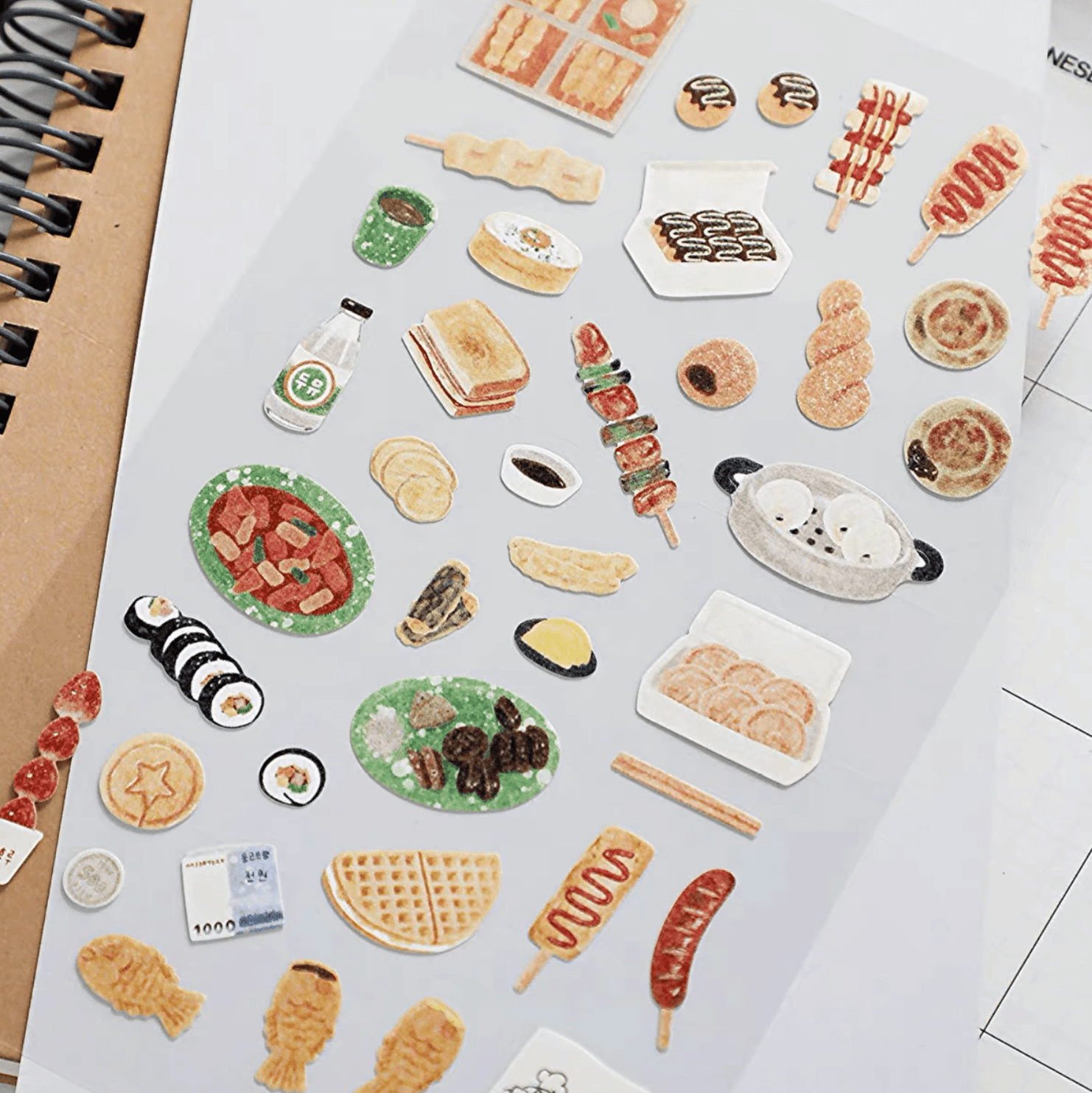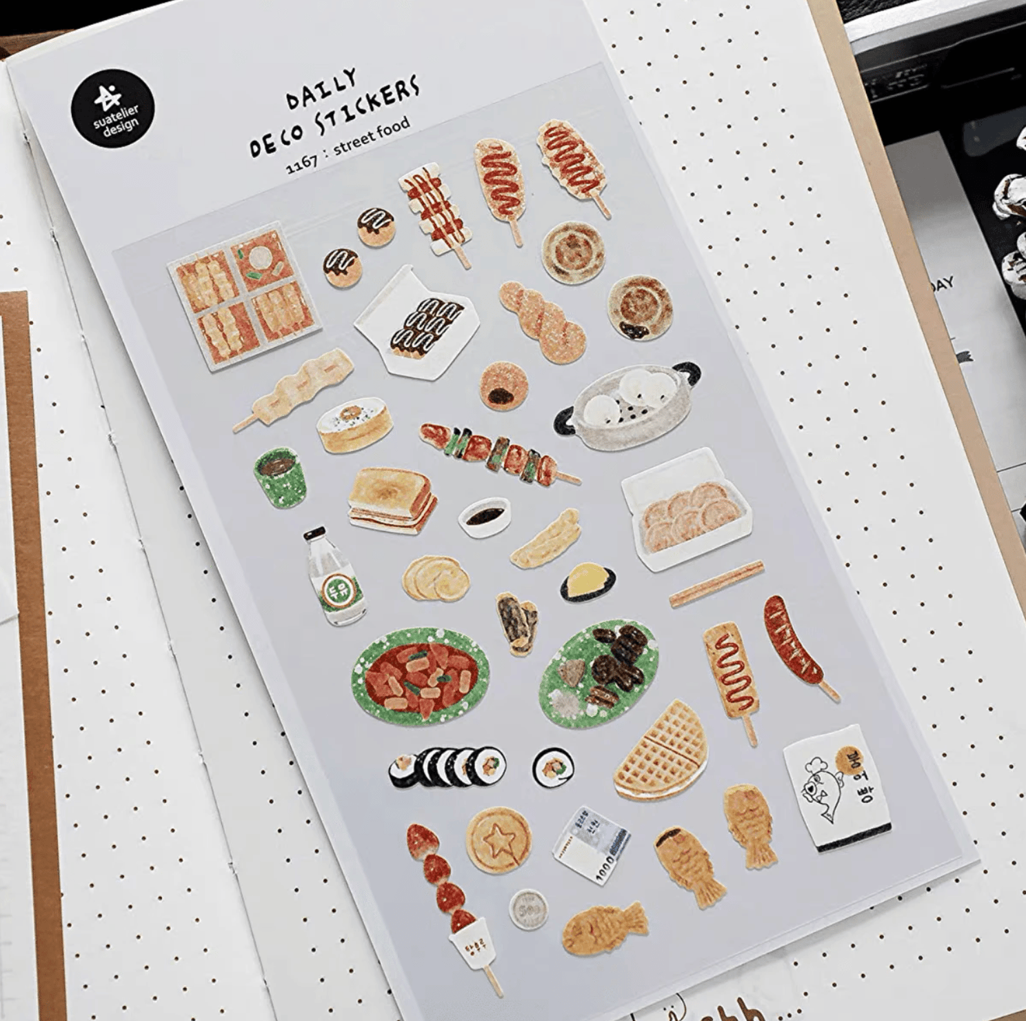 A lively stroll through a bustling street market, filled with the smell of sizzling snacks and colorful food stalls. This Suatelier sticker captures the fun and flavor of Korean street food culture, bringing playful foodie vibes straight to your journal pages. The glittery vinyl coating adds a bright shine, making each little treat stand out like a delicious highlight from a night market adventure β§