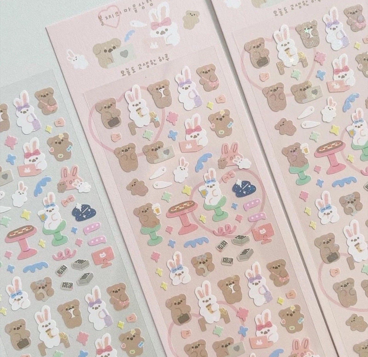 Meet the softest little office worker bear, busy typing away, sipping coffee, and getting through the day one task at a time. With its gentle pink tones and aesthetically pleasing Korean-style design, this sticker sheet captures those relatable workday moments in the cutest way possible. The holographic sparkle adds a fun little shine; like celebrating small wins after a productive day